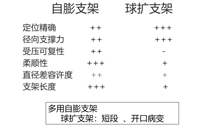 自膨支架 vs 球扩支架:自膨支架定位精确,柔顺性好,适用于长段病变;球扩支架径向支撑力强,适用于短段、开口病变。