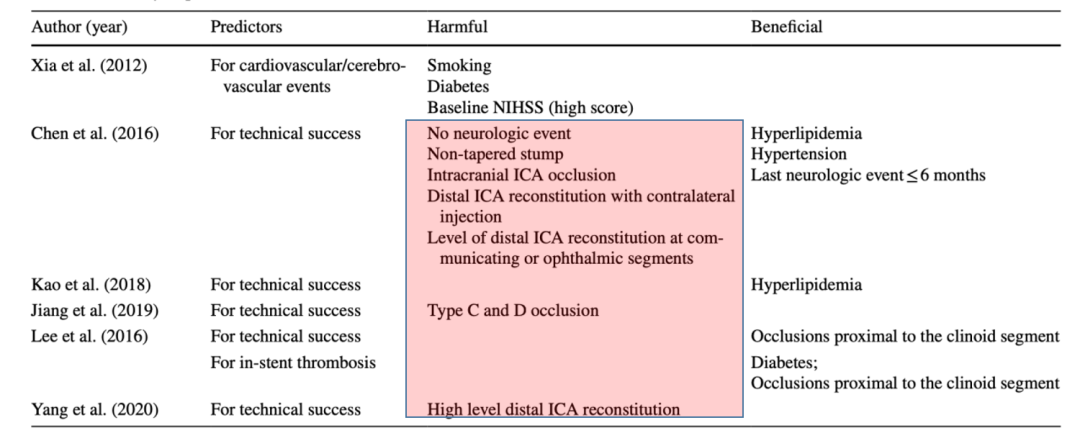 负面因素:无神经事件、非锥形残端、颅内ICA闭塞、C/D型病变(Xia 2012; Kao 2018)。
