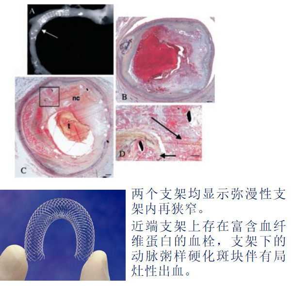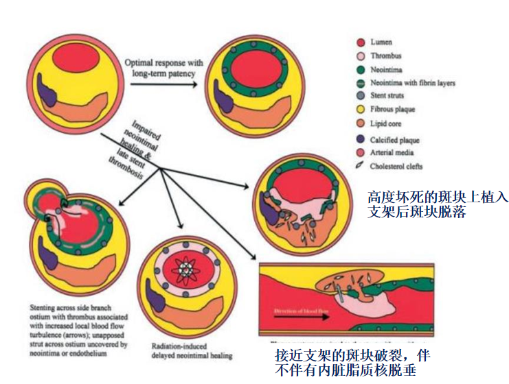 支架内血栓形成:与支架覆盖不足以及支架对斑块的挤压有关,而斑块破裂溢出形成血栓
