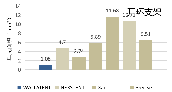 支架网孔面积比较:开环支架、FREE CELL、Xact、BASE等不同支架的网孔面积比较。