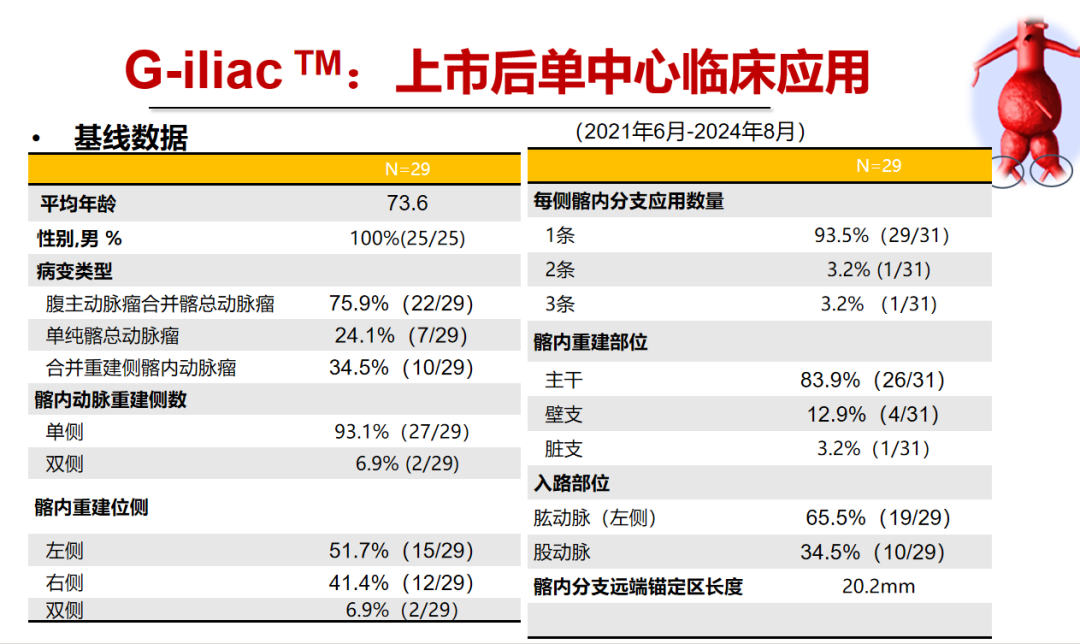 病例纳入:29例男性患者,平均年龄73.6岁,主要病变为腹主动脉瘤合并髂总动脉瘤(75.9%),34.5%需同期重建髂内动脉瘤。