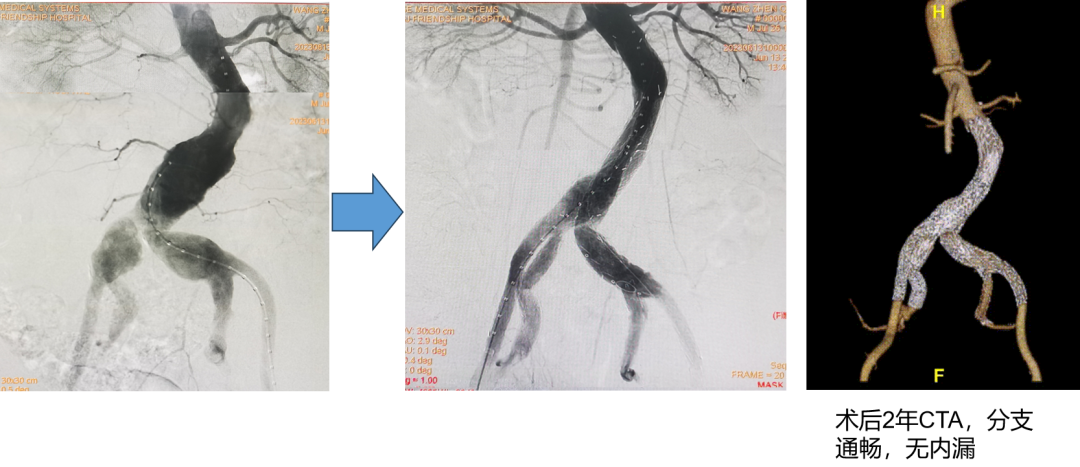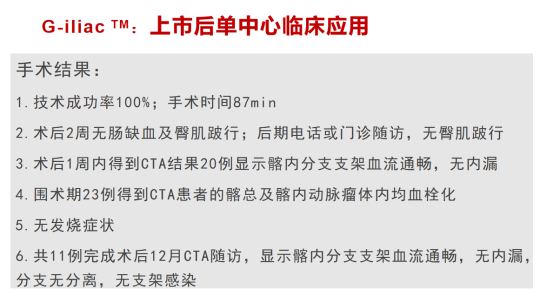 安全性优异:无肠缺血、臀肌跛行等并发症;20例CTA显示髂内分支支架血流通畅,无内漏;23例患者瘤体内血栓形成良好,降低破裂风险