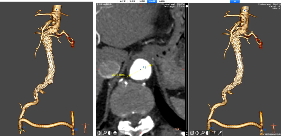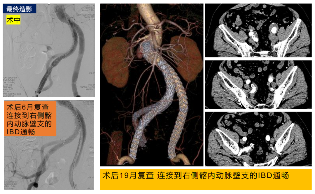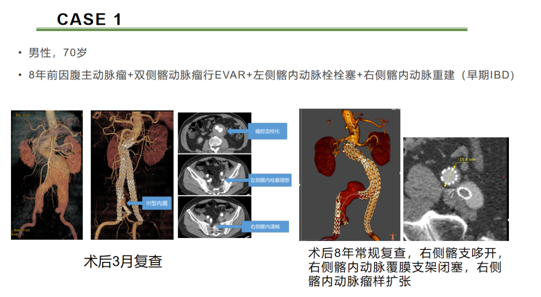 病情:患者男,70岁,8年前因腹主动脉瘤+双侧髂动脉瘤行EVAR术,左侧髂内动脉栓塞,右侧髂内动脉早期IBD重建。