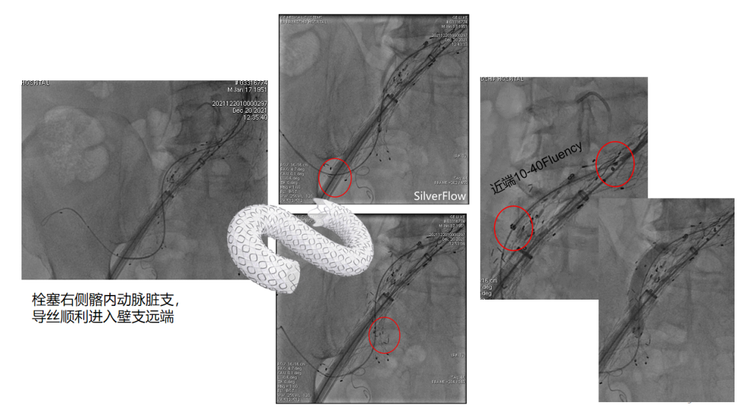 精准栓塞与重建:栓塞髂内动脉脏支,避免侧支出血;植入SilverFlow™覆膜支架至壁支远端,平行于原闭塞支架完成重建。