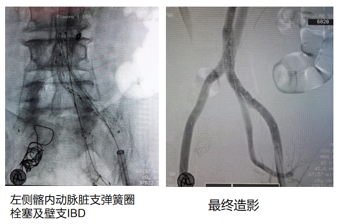 左侧髂内动脉处理:因腹主支架进入后不适合 IBD 近端锚定长度,采用栓塞主干预。