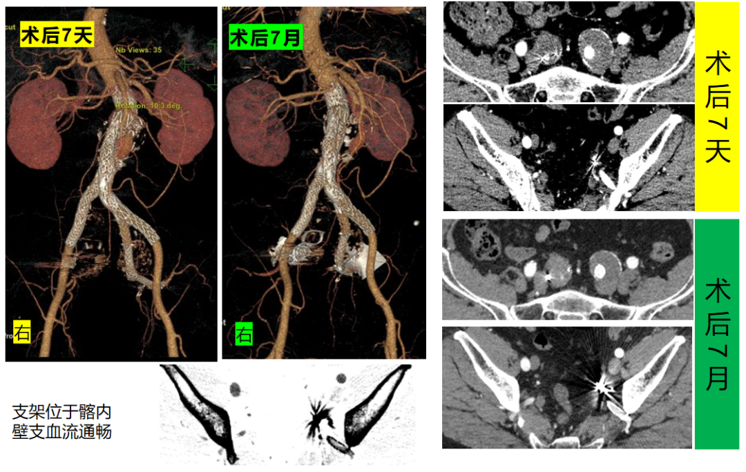 术后7天CTA显示支架位于髂内动脉分支内,血流通畅,无内漏等并发症迹象,周围组织未见异常。术后7月CTA检查,支架持续保持良好位置,髂内动脉分支血运稳定,动脉瘤无复发及增大,血管周围组织状态正常,表明手术远期效果良好。