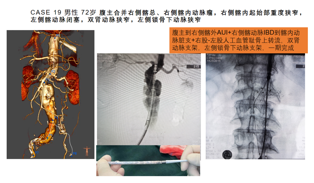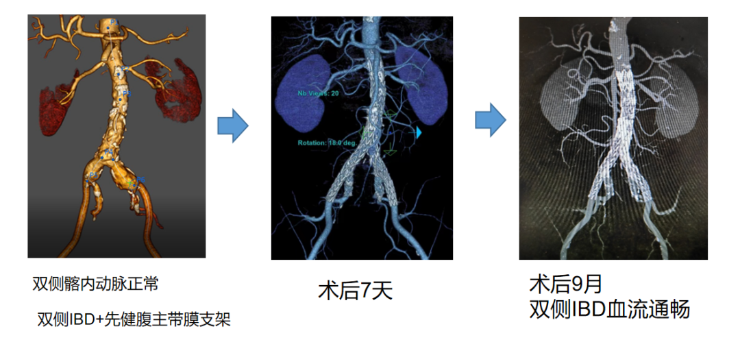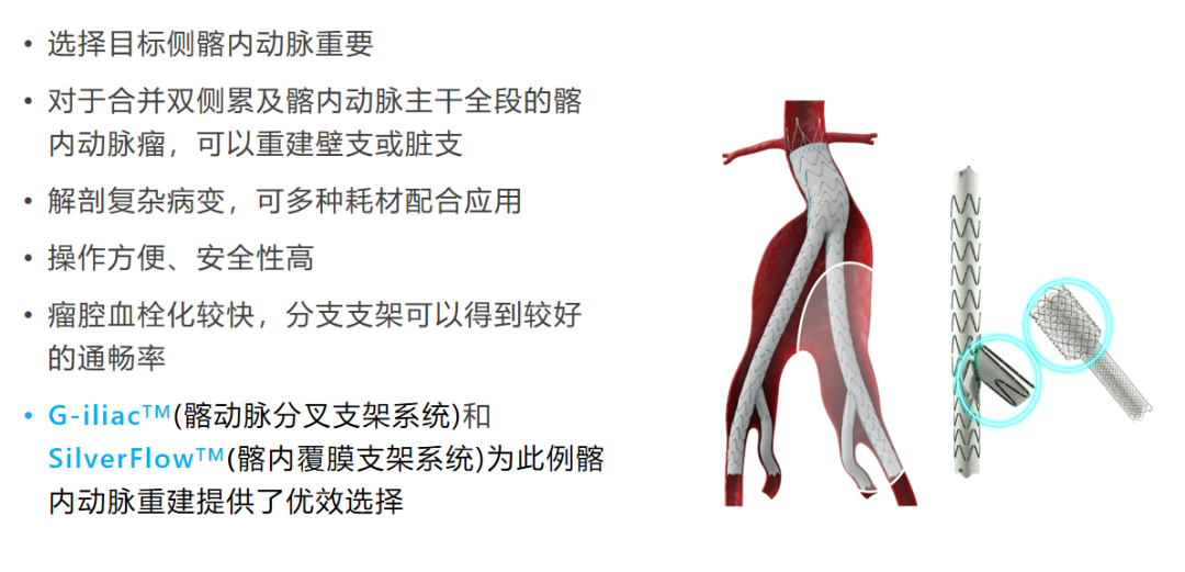 主髂动脉重建:腹主-右侧髂外动脉支架(AUI)+右侧髂内动脉IBD(脏支重建),保留肠道血供。