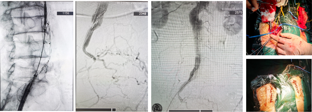 跨区域血运重建:右股-左股人工血管耻骨上转流,改善左侧下肢血供;同期植入肾动脉及锁骨下动脉支架,解除狭窄。