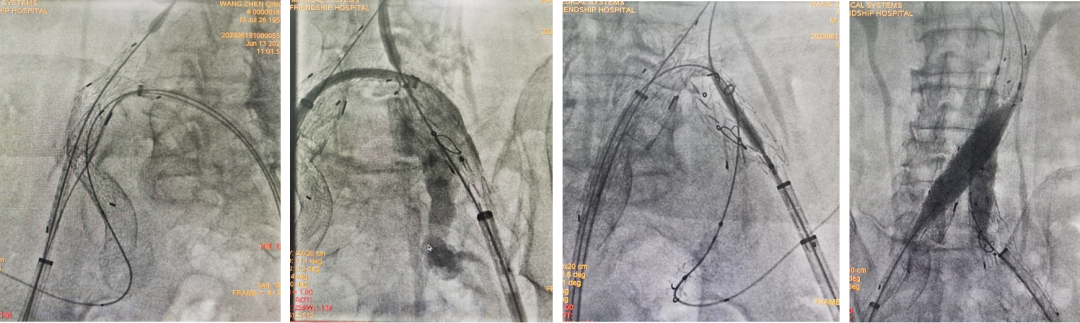策略与操作:双侧IBD重建:使用先健腹主带膜支架联合双侧G-iliac™支架,精准测量瘤颈长度后,将支架近端锚定于腹主末端,远端覆盖髂内动脉开口。