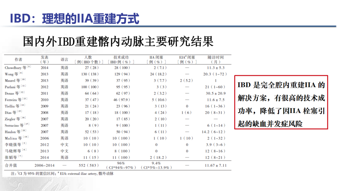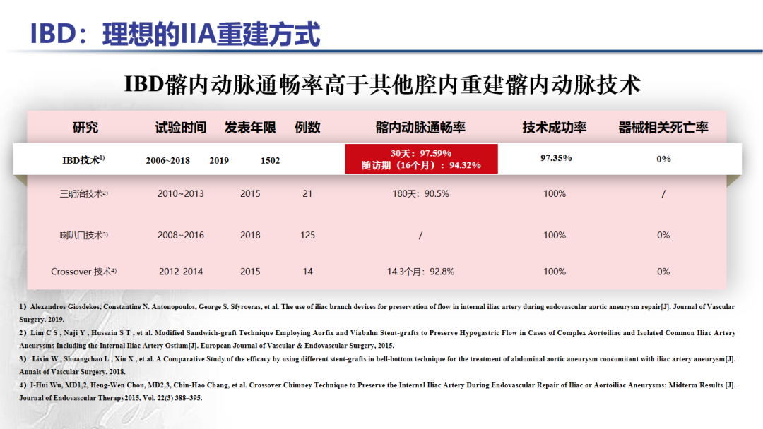 IBD技术优势在于可以完全腔内操作,解剖适配性强,技术成功率高,1年通畅率高于其他腔内重建髂内动脉技术,并能显著降低因栓塞导致的缺血并发症,尤其适用于双侧髂动脉瘤、髂内动脉开口狭窄/扭曲等复杂病例。