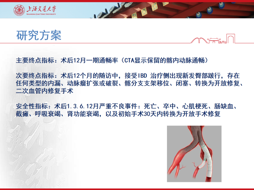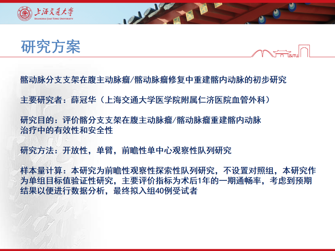 本研究通过开放性,单臂,前瞻性单中心观察性列队研究,评价髂分支支架在腹主动脉瘤/略动脉瘤重建髂内动脉治疗中的有效性和安全性。由于国内髂内动脉重建的真实世界数据有限,开展研究者发起的临床研究(IIT)至关重要,从研究方案的设计,学术内容审查(样本量计算、统计方法)、伦理审核(受试者权益保护),在国家医学研究登记系统及Clinical Trials.gov注册(如仁济医院研究获NCT06162273编号),确保研究透明性与可追溯性。每个环节都必不可少,内容需要多阶段严格审核。