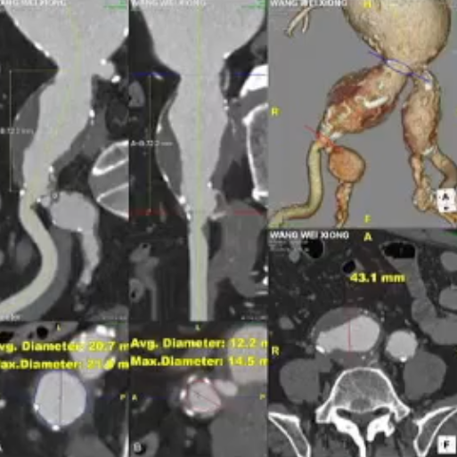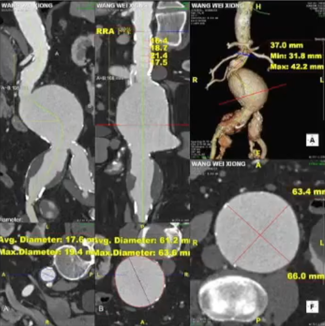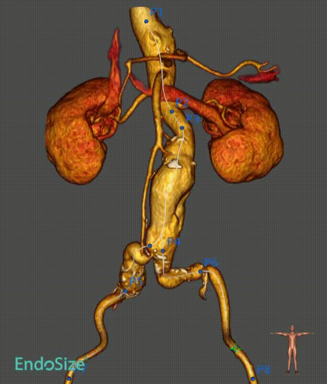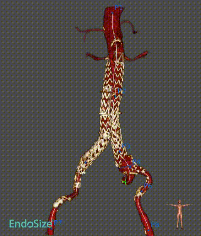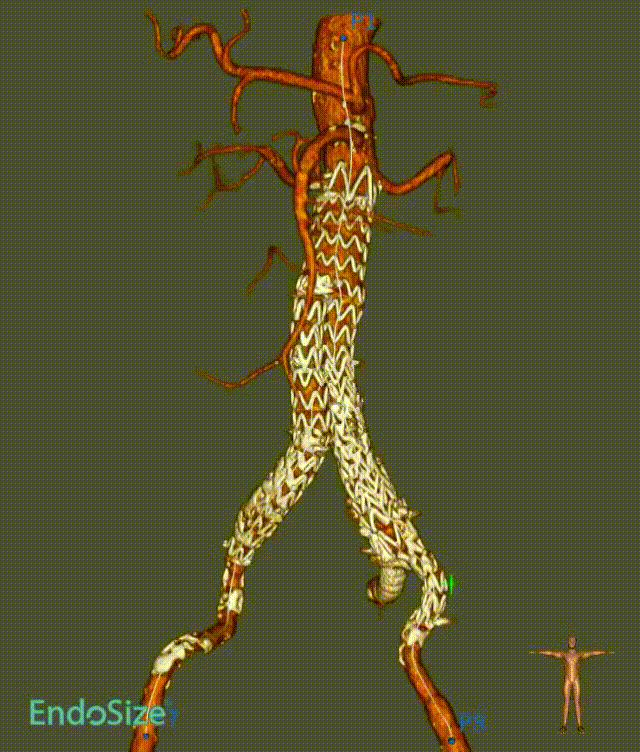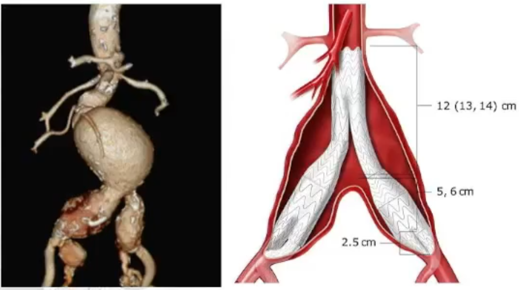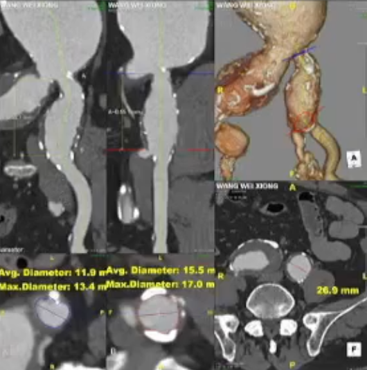 术前情况:74岁男性,肾下腹主动脉瘤,瘤体最大直径66mm,累及双侧髂总,右侧髂内扩张伴开口狭窄,左侧髂内夹层。