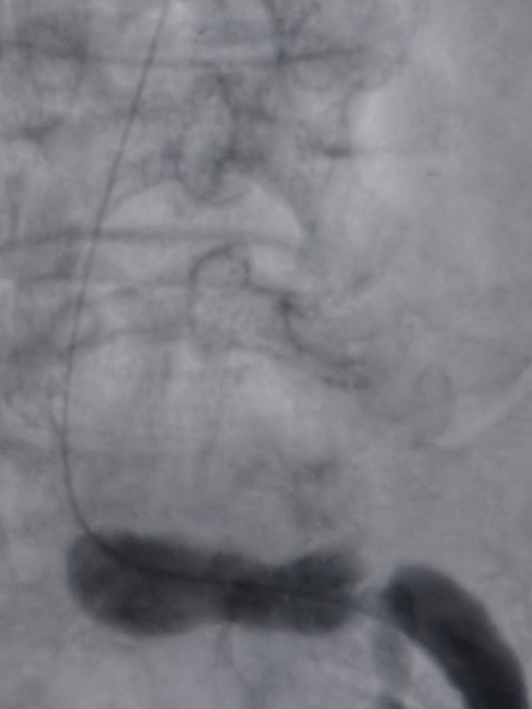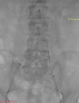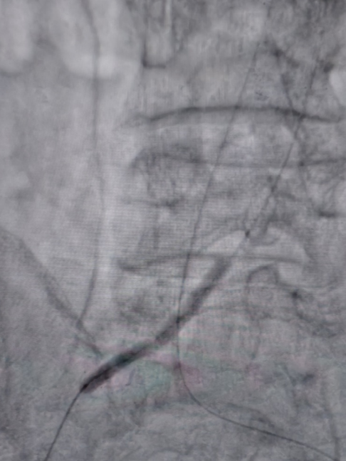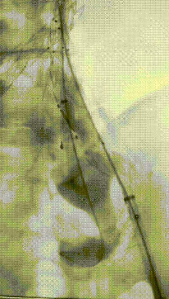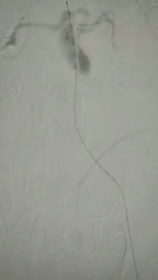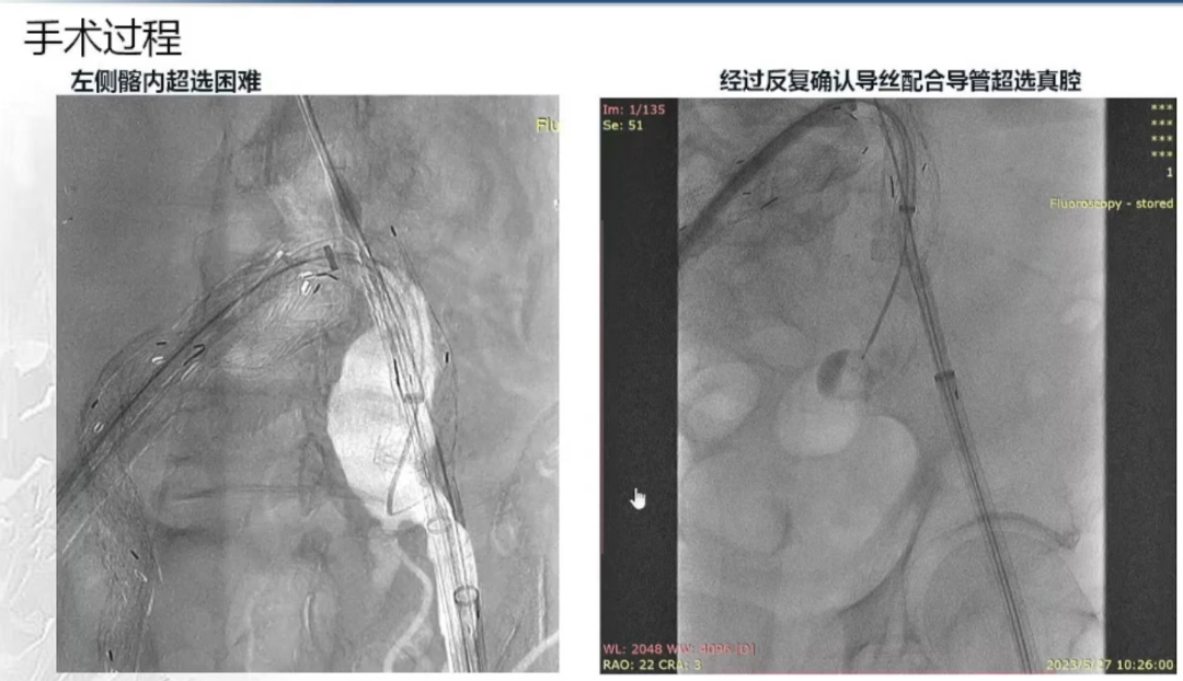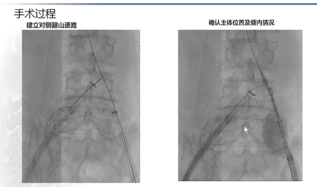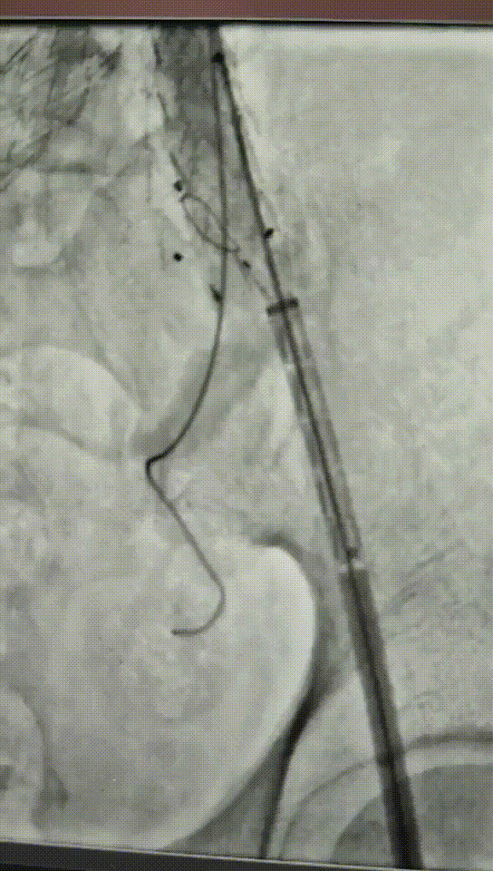 手术过程:根据患者及家属要求保双侧髂内,遂计划双侧髂内重建,右侧优先,左侧髂内情况尝试开通。手术中,先进行造影和翻山建立通路。