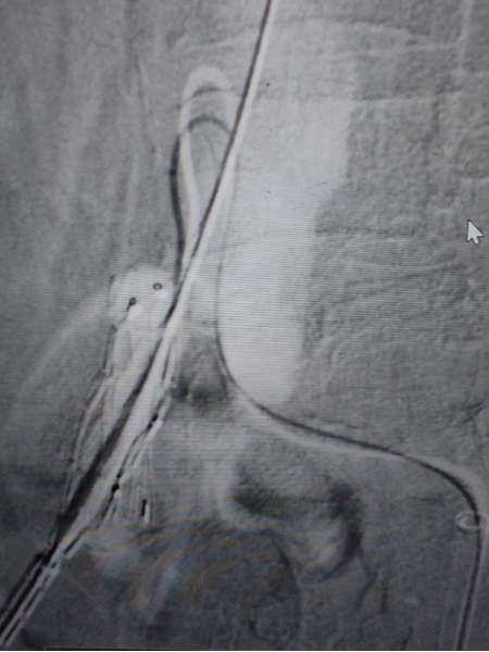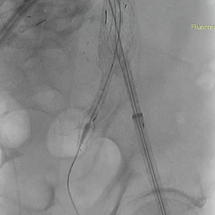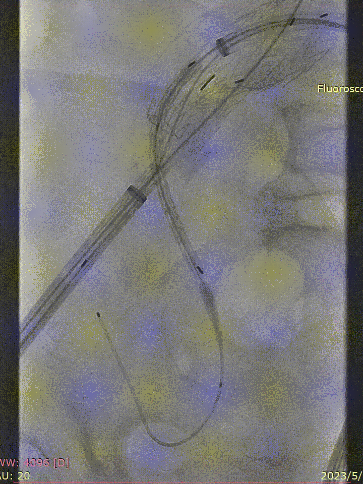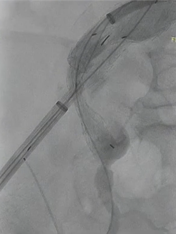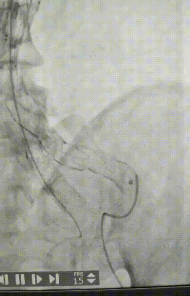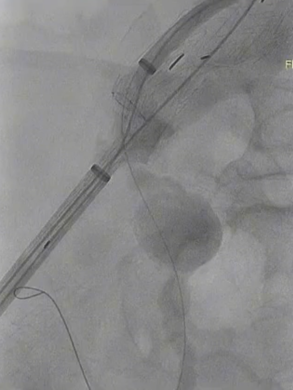 手术过程:采用短主体翻山技术重建右侧,在输送主体前,针对髂动脉多处狭窄、扭曲的情况,使用球囊预扩。之后,在微导丝、微导管的配合下艰难超选髂内动脉,成功将支架置入。