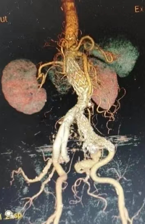 术后情况:造影提示动脉瘤完全隔绝,手术成功实现了保留双侧髂内动脉并隔绝动脉瘤的目标,患者病情得到有效控制。