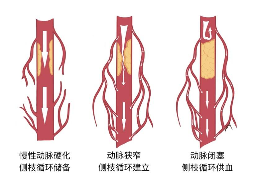 动脉血管如同一条河流的主干道,若主干堵了,河水就不能正常地流向远方。但是如果就近存在一些小支流,河水就可以从这些小支流向更远的地方。