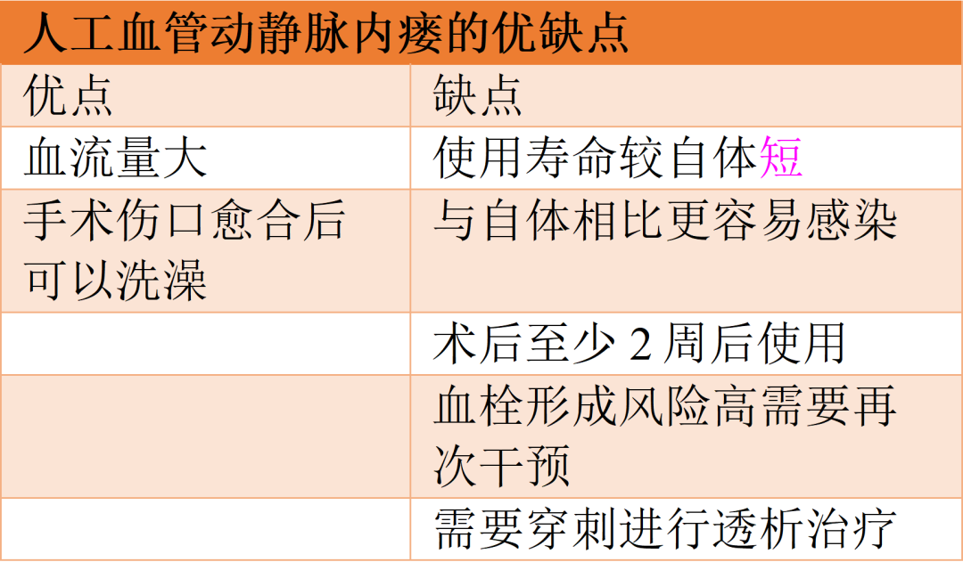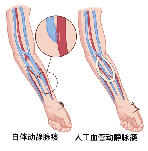 1. 自体动静脉内瘘:常作为首选。直接将自身浅表静脉与动脉吻合,优点是使用时间长,感染、血栓发生率低。