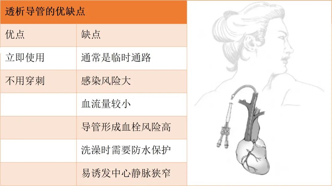 3. 透析导管:常用于急诊血透或等待自体内瘘成熟阶段,一旦内瘘可以使用需将导管拔除。当患者无法建立内瘘时或建立失败时导管也被长期使用。透析导管虽然可即插即用但易诱发血栓、血管腔狭窄闭塞或感染等并发症。