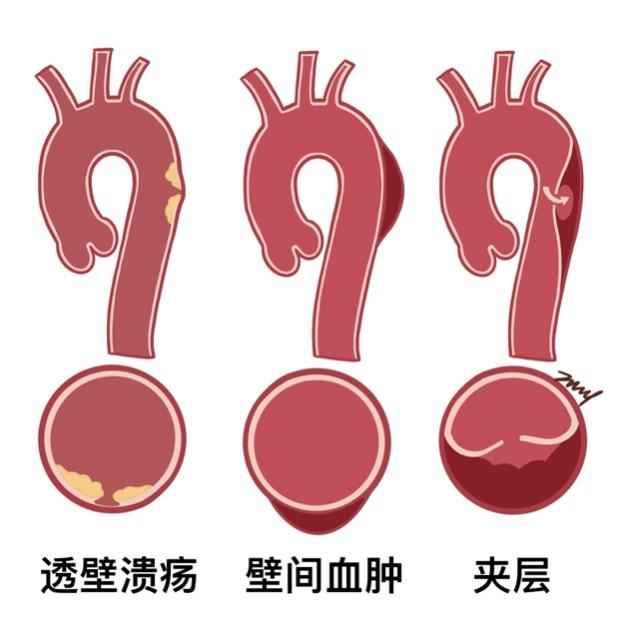主动脉夹层、主动脉壁间血肿、主动脉溃疡,三者有一定的相似性。主动脉壁间血肿、主动脉溃疡会发展成主动脉夹层。因此把这三者统称为急性主动脉综合征。