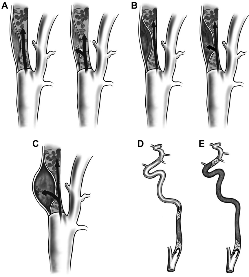 图为计算机断层血管造影容积渲染图像上自发性颈动脉夹层的分类。A,I 型,管腔狭窄 <70% 的壁内血肿或夹层;B,II 型,管腔狭窄≥70% 的壁内血肿或夹层;C,III 型,夹层假性动脉瘤;D,IVA 型,颅外颈动脉闭塞;E,IVB 型,串联闭塞。