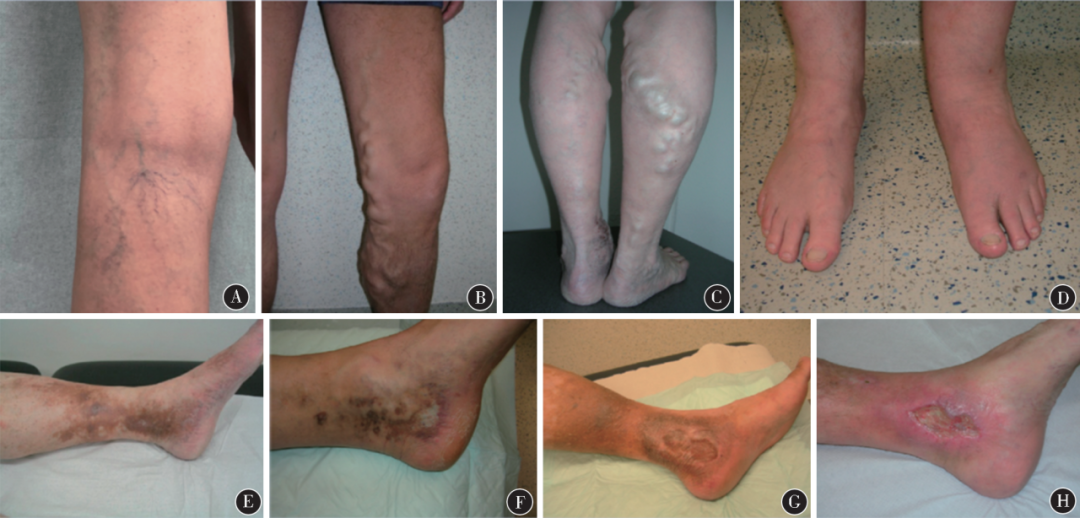 患者主观感受到的我们称之为症状,而患者和医生可以客观观察到的则称为疾病的体征。患有慢性静脉疾病的患者可能会出现各种症状,并展现许多临床体征。患者经常报告疼痛,可能是悸动感、灼热感或像肌肉痉挛。这种痉挛通常发生在夜间。其他常见的抱怨包括腿部沉重和疲劳感,特别是在晚上感到肿胀,并且皮肤瘙痒。所有这些症状在长时间站立后会加重。检查腿部时的临床体征包括从小静脉(图16A)到静脉曲张的扩张静脉,有时可能相当显著(图16B和C)。此外,下肢下部的肿胀,特别是脚部和脚踝的肿胀是典型特征(图16D)。在疾病的更进一步阶段,皮肤可能出现从褐色色素沉着(图16E)、白色变色(图16F)和之前皮肤破损留下的疤痕(图16G)到现有的皮肤破损(称为“活动性静脉性腿溃疡”)(图16H)的变化。鉴于上述症状和体征,慢性静脉疾病对患者的生活质量有负面影响。