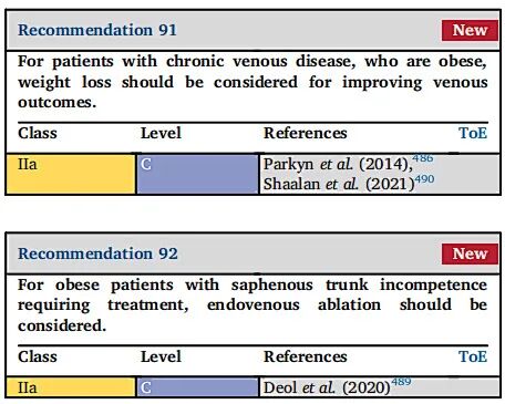 对于肥胖的慢性静脉疾病患者,应考虑减轻体重以改善静脉相关结果。 | ||