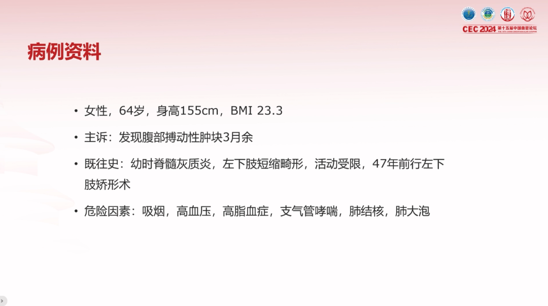 64岁女性,身高155cm,BMI23.3,因“发现腹部搏动性肿块3月”就诊。既往史包括幼时脊髓灰质炎致左下肢短缩畸形、活动受限,47年前左下肢矫形术,合并吸烟、高血压、高脂血症、支气管哮喘、肺结核、肺大泡,因心肺功能及体型因素无法耐受开放手术。