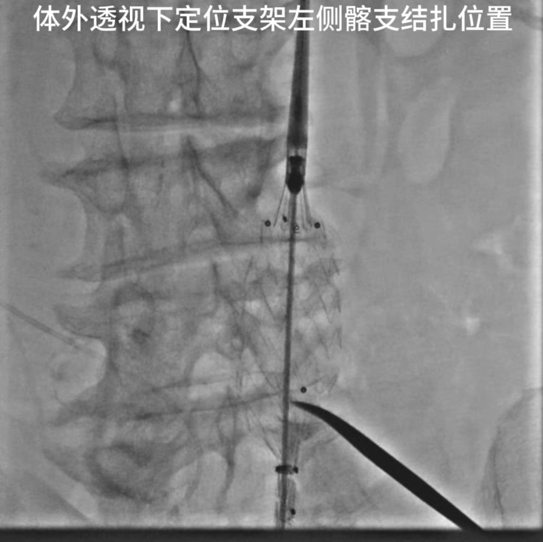 切开双侧腹股沟,暴露股动脉;体外将25×16×14×5mm腹主动脉支架短腿捆扎,构建AUI系统,通过捆扎使支架呈单髂支形态,便于经右侧入路植入。