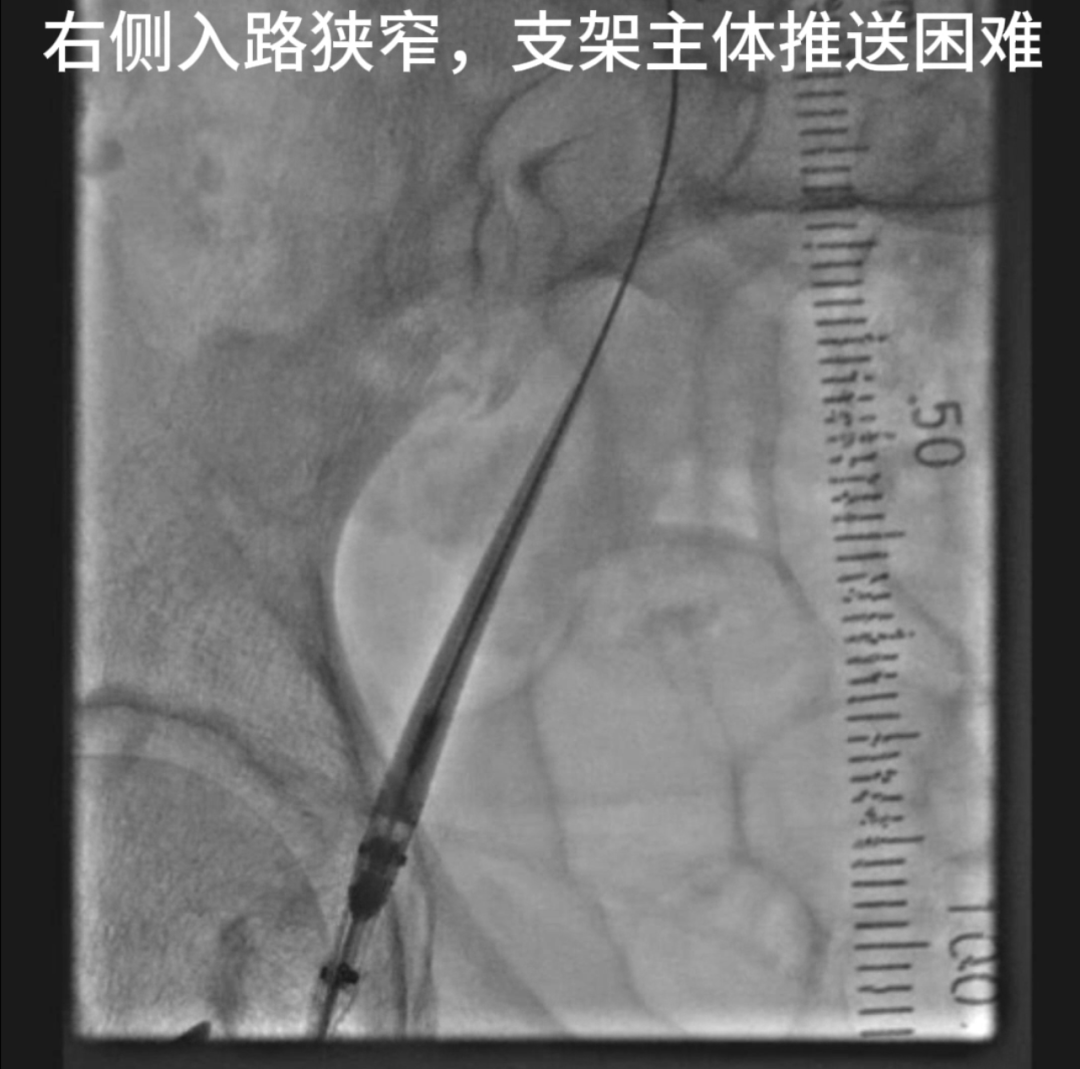 右侧髂外动脉5mm管腔通过6mm输送系统时,采用预扩张策略:使用6mm球囊对髂外动脉进行短暂扩张,利用血管弹性代偿,成功完成支架输送,避免了血管损伤或中转开放手术。