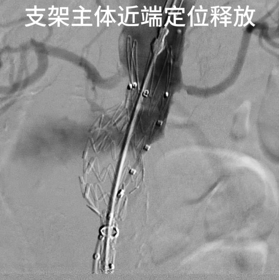 动脉瘤特征:肾下型腹主动脉瘤(AAA),大小60×59.5mm,近端瘤颈扭曲、长度22mm,远端累及腹主动脉分叉,分叉处直径14mm。