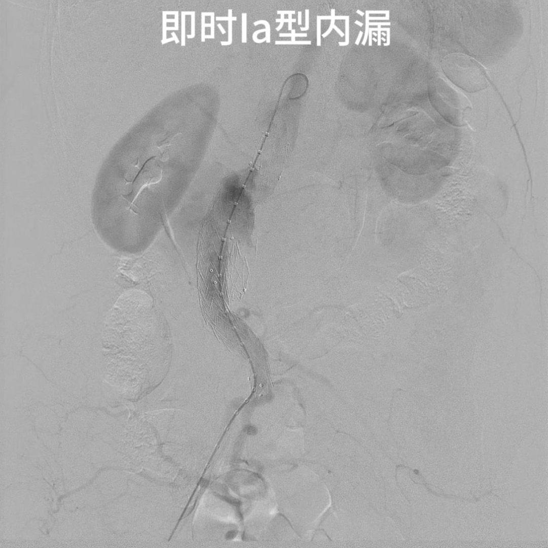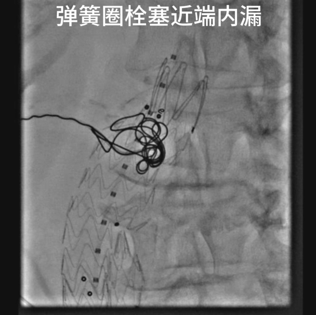 支架释放后出现近端Ⅰ型内漏,原因为瘤颈短、成角大导致支架贴附不充分。经左侧股动脉入路超选至瘤颈近端,以弹簧圈填充瘤颈间隙,造影显示内漏显著减少,达到临床可接受标准。