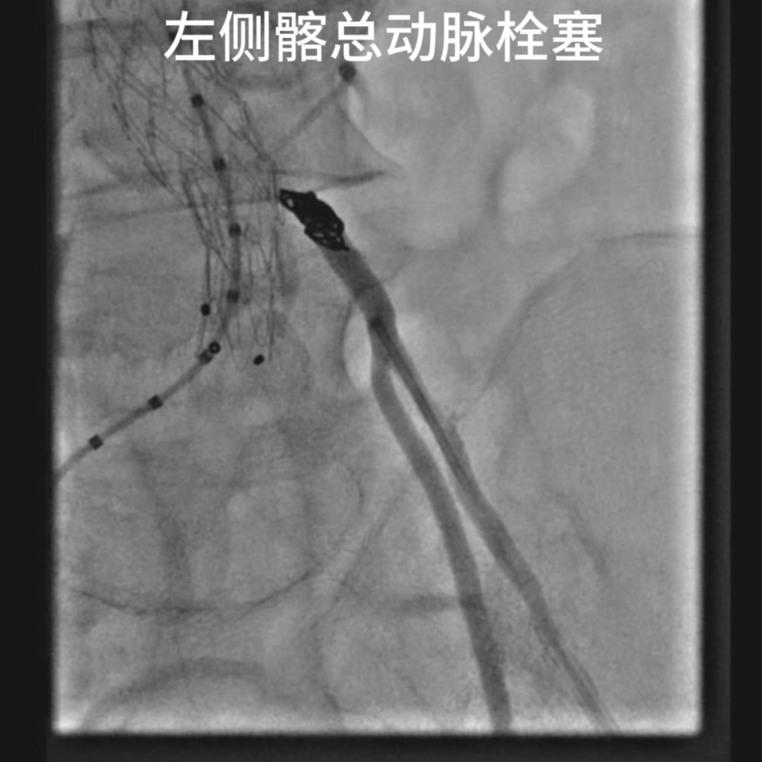 先栓塞肠系膜下动脉,减少潜在Ⅱ型内漏风险。经左侧股总动脉以6-20mm弹簧圈栓塞左髂总动脉根部,彻底封闭左侧髂动脉血流,避免内漏及侧支供血。