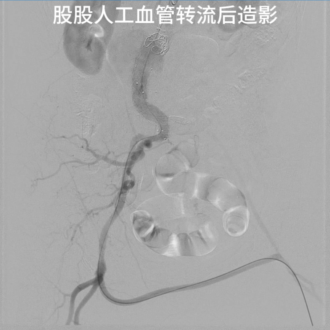 以8mm人工血管经耻骨联合皮下隧道行双侧股总动脉转流,恢复左下肢血运,造影显示人工血管桥通畅无狭窄。
