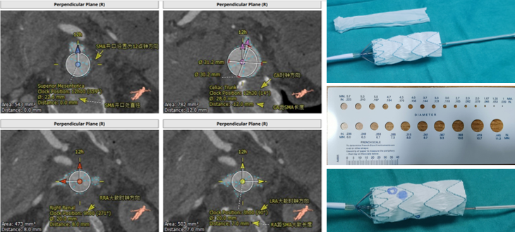 ② 美敦力腹主支架花冠密集,要注意“避坑”;解决方法可以选择SMA部位开槽,利用开槽来导入长鞘