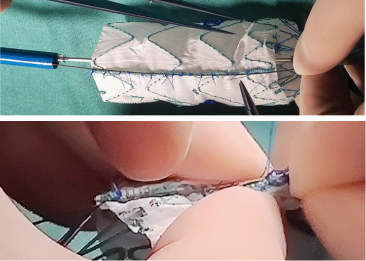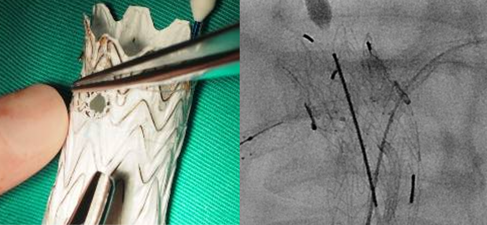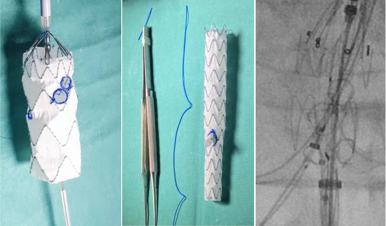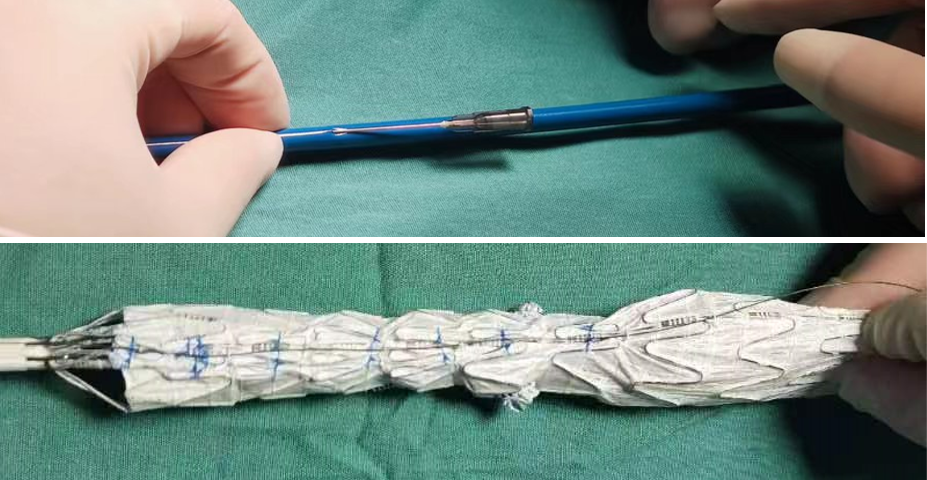 ① 如果需要缝制分支的话,首选先健的胸主动脉用于开窗,23F的外鞘可以容纳并行的2根分支“辫子”以及2根0.014的束径或是牵引导丝。