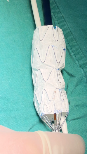 建议导丝从支架头端完全出来,从上肢动脉入路牵出,这样可以避免束径的“误释放”。