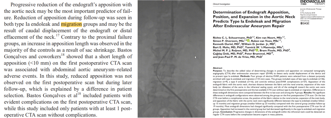 文献报道,支架移位较Ⅰ型内漏在随访过程中可能出现更多并发症。即时下移只有2毫米左右,如果不掌控其原因,也可能导致严重内漏。即时下移需要加以重视,并严密控制。