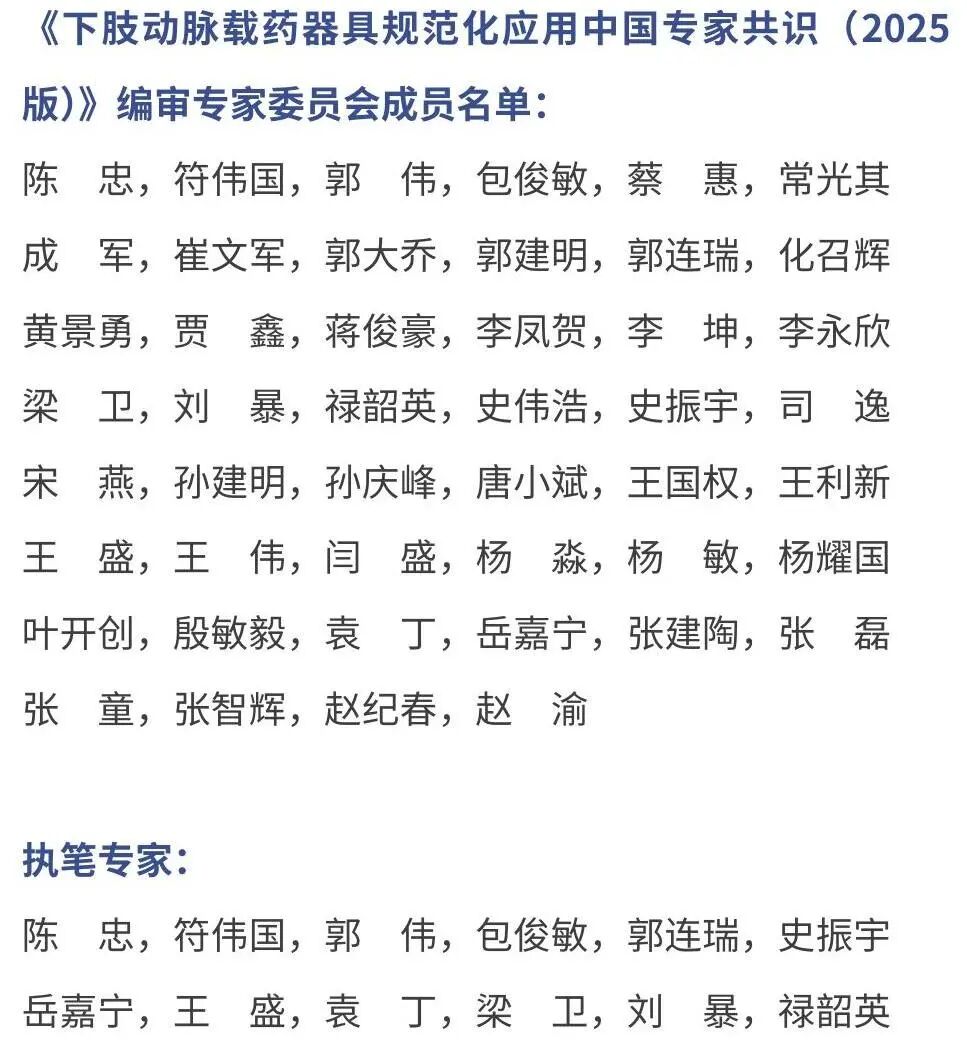2025年8月25日,由中华医学会外科学分会血管外科学组、中国医师协会血管外科医师分会联合牵头,陈忠教授、符伟国教授、郭伟教授、包俊敏教授等46位国内权威专家共同参与制定的《下肢动脉载药器具规范化应用中国专家共识(2025版)》(以下简称《共识》),于《中国实用外科杂志》2025年8月刊正式发布。