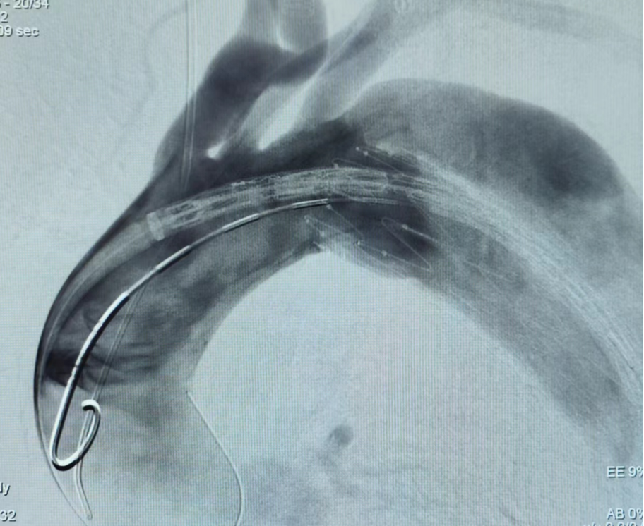 超选后可用猪尾巴导管确认导管在支架腔内;