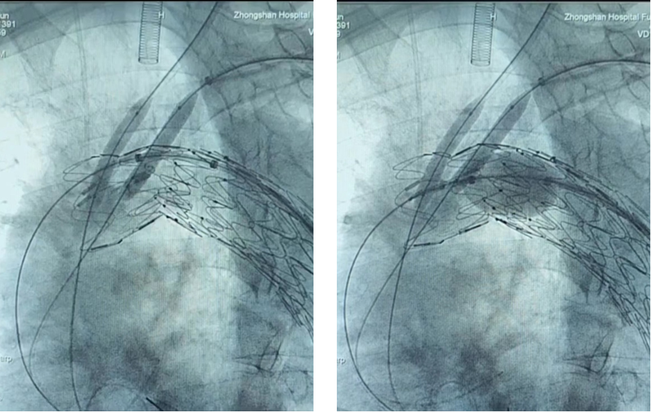 略往分支动脉开口近心端释放,释放出窗口后超选,球囊固定,支架完全释放;