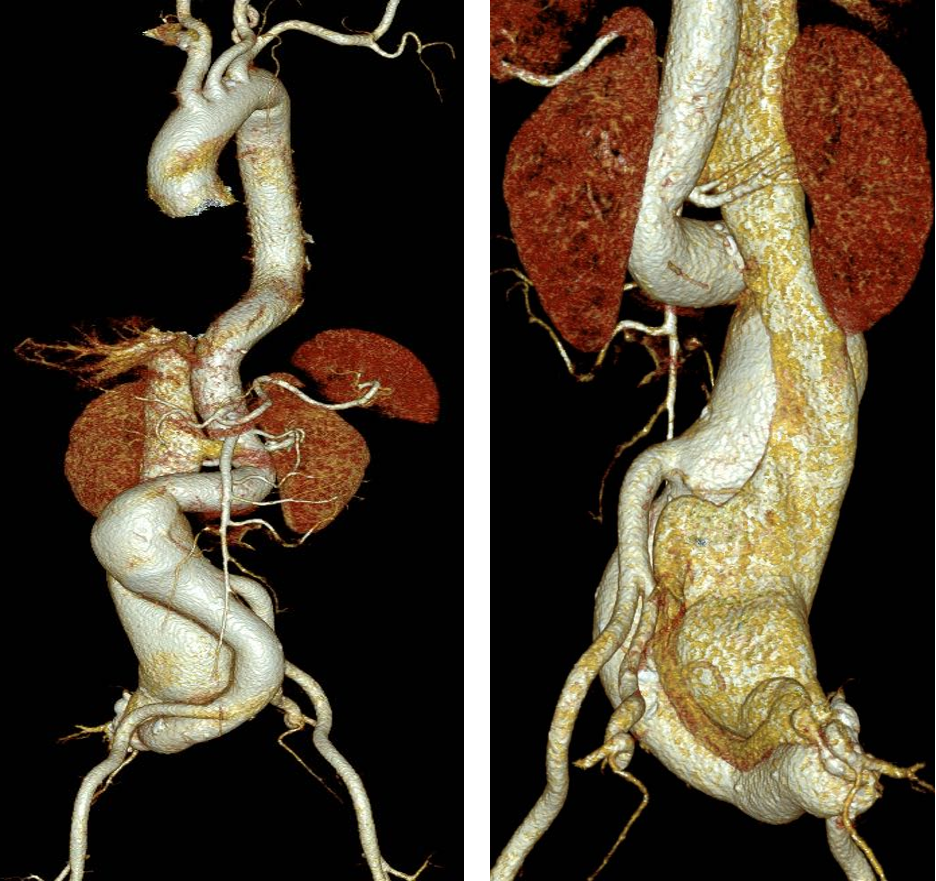 CTA:腹主动脉瘤、右侧髂总动脉及髂内动脉瘤,临近下腔静脉受压、推移且瘤样扩张,右侧髂内动静脉瘘形成