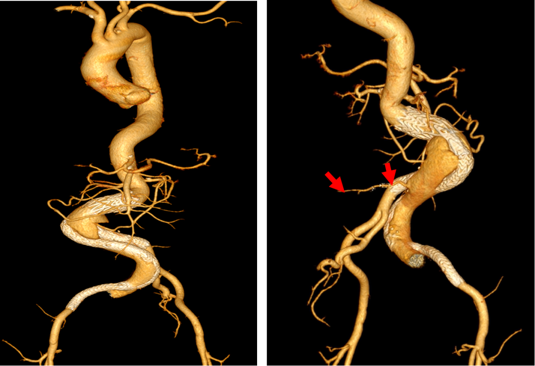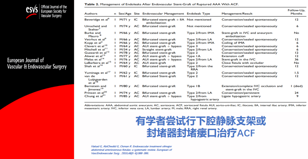 AAA合并腔静脉瘘比较罕见,处理起来也十分棘手。对于这类患者,治疗时需动静双向栓塞或阻断,单纯阻断动脉供血不可取,会增加臀肌和内脏缺血的风险。术后若出现低流量II型内漏,可考虑保守治疗;但对于高流量的I型、II型或III型内漏,则必须修复。在尝试使用下腔静脉支架或封堵器封堵动静脉瘘时,要充分权衡其带来的并发症风险。