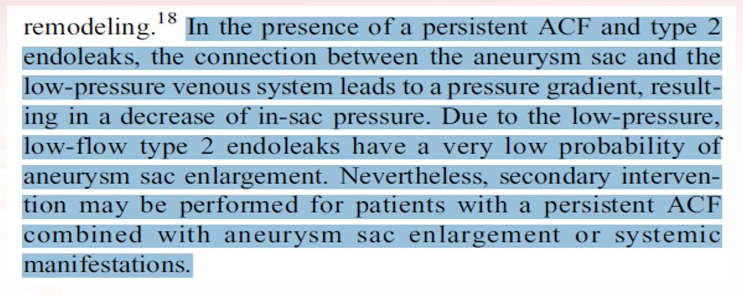 当存在持续性的ACF和II型内漏时,动脉瘤囊与低压静脉系统之间会形成压力梯度,导致瘤囊内压力降低。在这种低压状态下,低流量的II型内漏致使动脉瘤囊增大的概率较低。对于那些ACF持续存在,且伴有动脉瘤增大或全身症状的患者,往往需要进行二次干预。