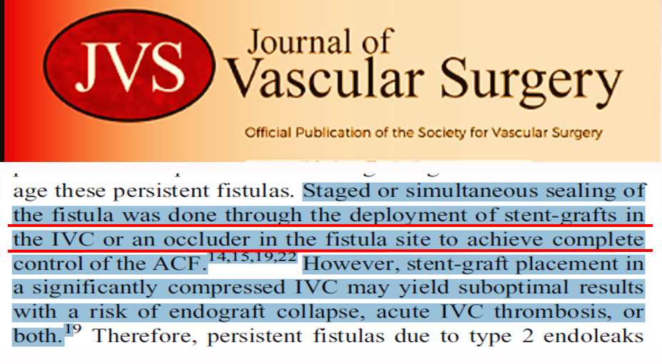 Melas N, Saratzis A, Saratzis N, Lazaridis I, Kiskinis D. Inferiorvena cava stent-graft placement to treat endoleak associated with an aortocaval fistula. J Endovasc Ther. 2017;18(2):250-254.