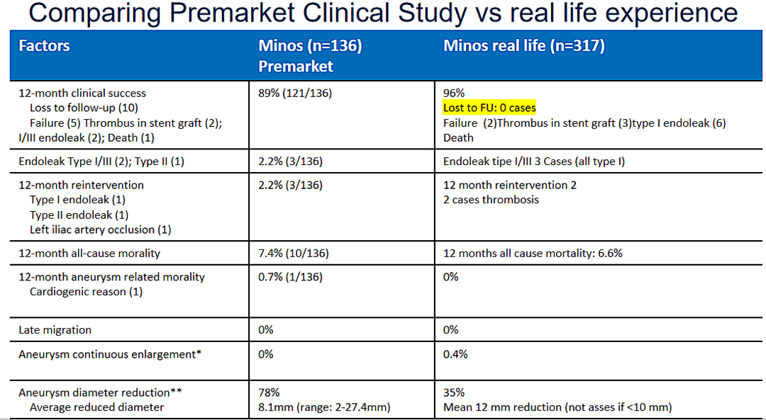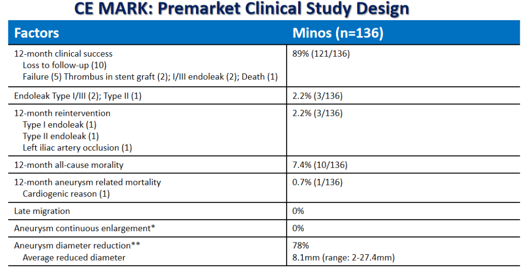 Minos欧洲136例患者的上市前临床研究,12个月临床成功率达89%(121/136),再干预率2.2%(3/136),全因死亡率7.4%(10/136),动脉瘤相关死亡率0.7%(1/136),晚期移位率0%,78%的腹主动脉瘤直径缩小,平均缩小8.1mm(范围2-27.4mm)。