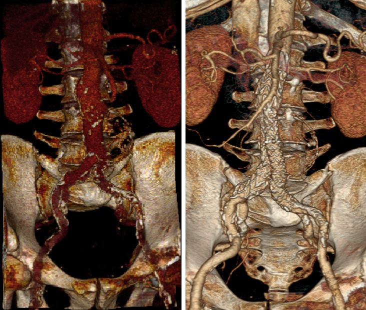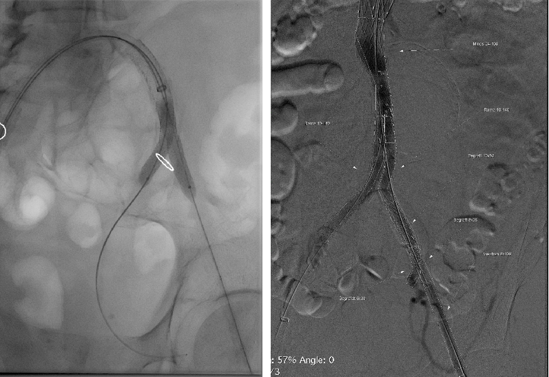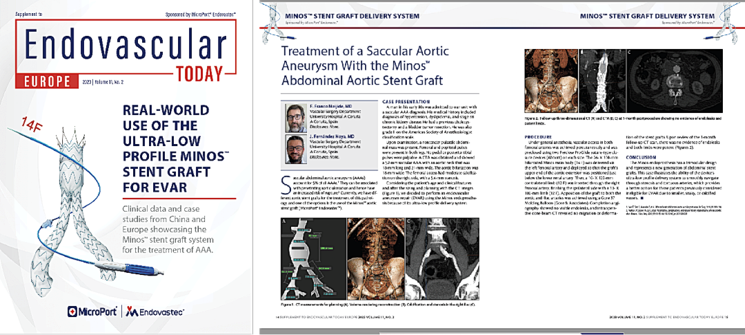 患者男性,73岁,腹主动脉瘤,高血压、血脂异常、慢性肾病。右侧股动脉中度钙化,直径5.4mm,入路面临挑战。选用Minos覆膜支架进行治疗,手术过程顺利,术后1个月的CT扫描显示无内漏且肢体通畅。该案例体现了Minos覆膜支架的Low Profile的低外径输送系统能够在狭窄和迂曲的动脉中顺利操作,为因血管条件不佳而不适合传统EVAR的患者提供了新的治疗选择。