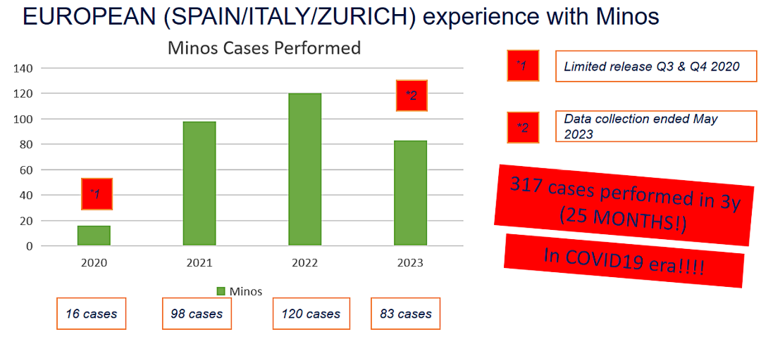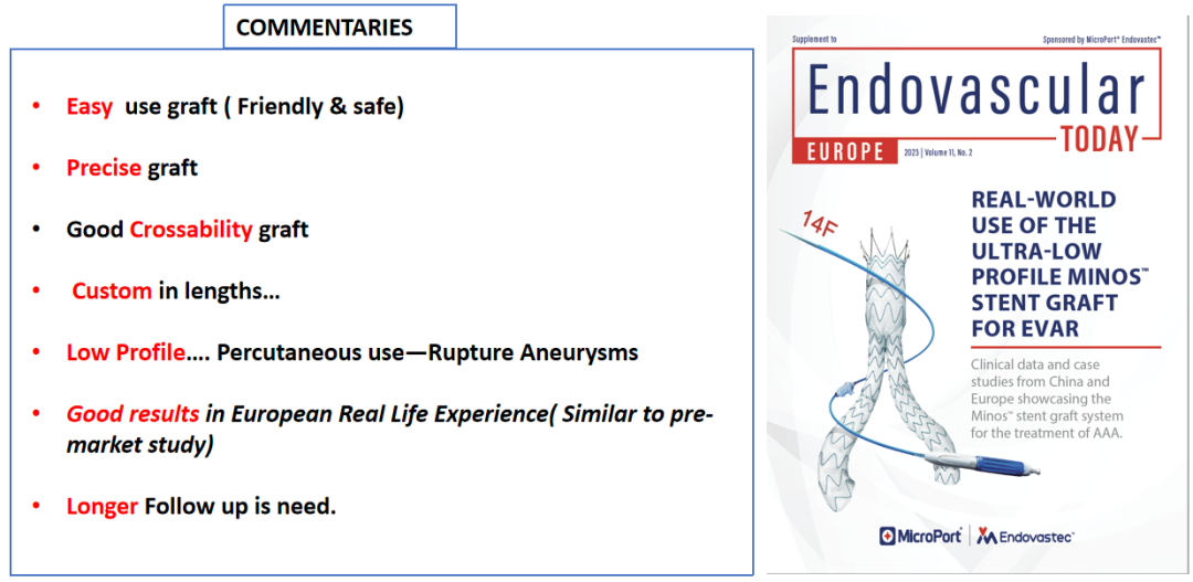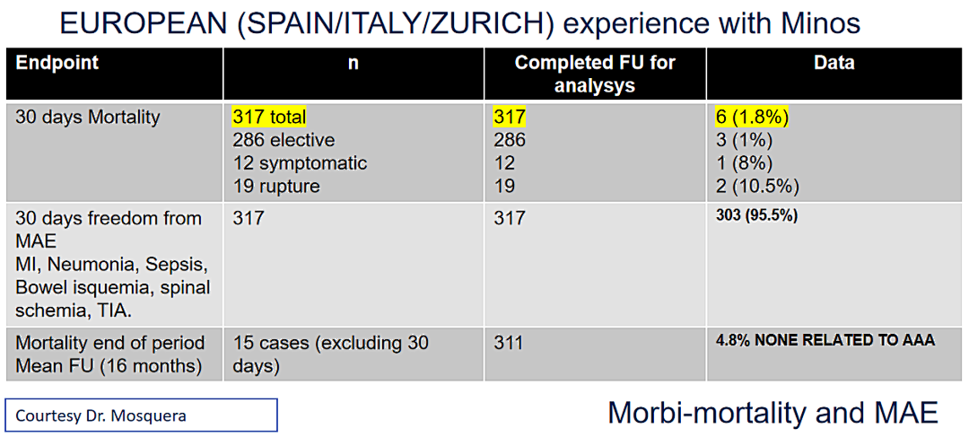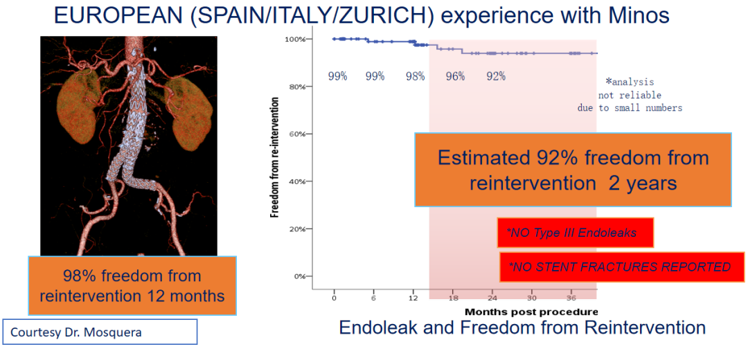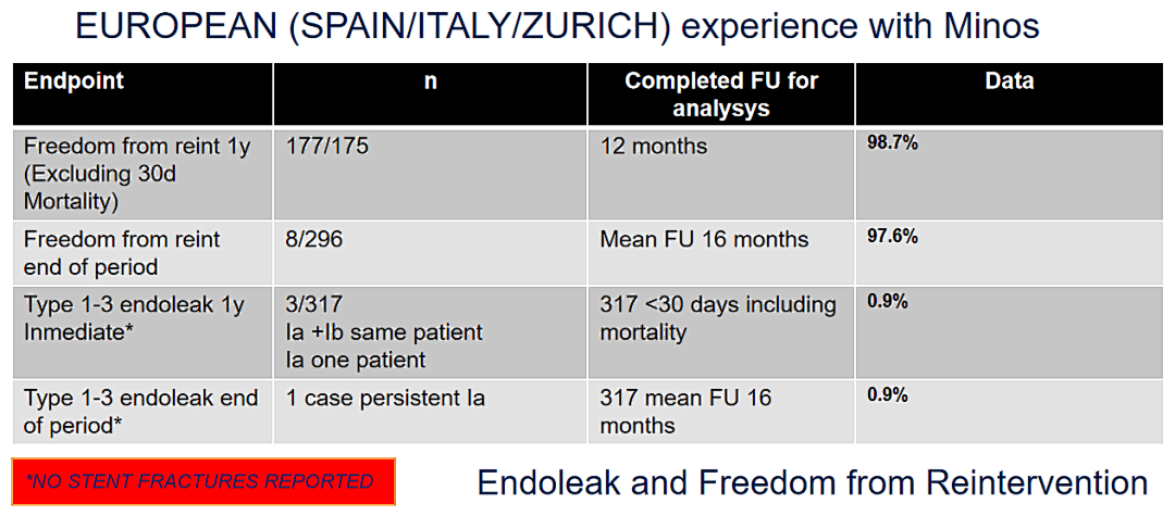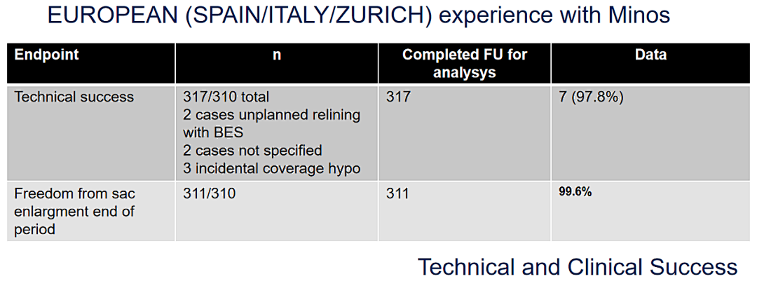 欧洲(西班牙/意大利/苏黎世)真实世界临床应用经验同样令人鼓舞。317例病例中,技术成功率达97.8%(310/317),99.6%(311/310)患者无动脉瘤增大,30天死亡率1.8%(6/317),30天无主要不良事件(MAE,如心肌梗死、肺炎等)发生率达95.5%(303/317),预估1年无需再干预率98%,2年无需再干预率92%(虽因样本量小部分分析可靠性受限,但趋势良好)。
