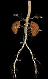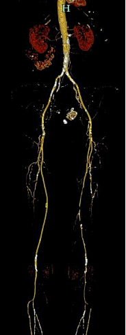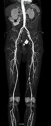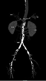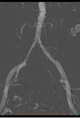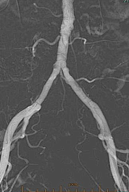术前CTA:腹主及双侧髂动脉多处钙化病变伴管腔狭窄。