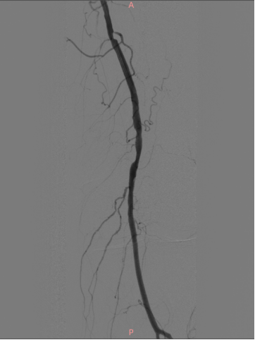 术前CTA:腹主动脉及双下肢动脉粥样硬化改变,左股浅动脉中下段重度狭窄接近闭塞,左股浅动脉下段、腘动脉、膝下分支多处钙化病变。