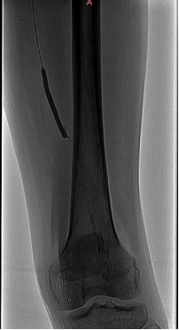 计划采用穿刺右股动脉+翻山入路。导丝真腔通过闭塞段后,使用Shockwave冲击波导管对钙化病变进行治疗。再根据是否有限制性夹层决定是否行补救性支架植入。